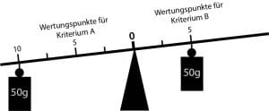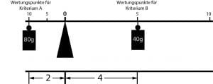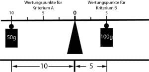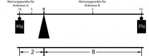 Die unterschiedliche maximale Wertungspunktzahl der beiden Bewertungskriterien sorgt für ein Ungleichgewicht und führt zu einer Veränderung der Gewichtung. Die folgende Abbildung zeigt dies anschaulich durch eine Balkenwaage. Die beiden 50g-Gewichte führen aufgrund des unterschiedlichen Abstands auf dem Waagebalken zu einem Ungleichgewicht. Das Kriterium A wird aufgrund des größeren Abstands auf dem Waagebalken stärker gewichtet als das Kriterium B.