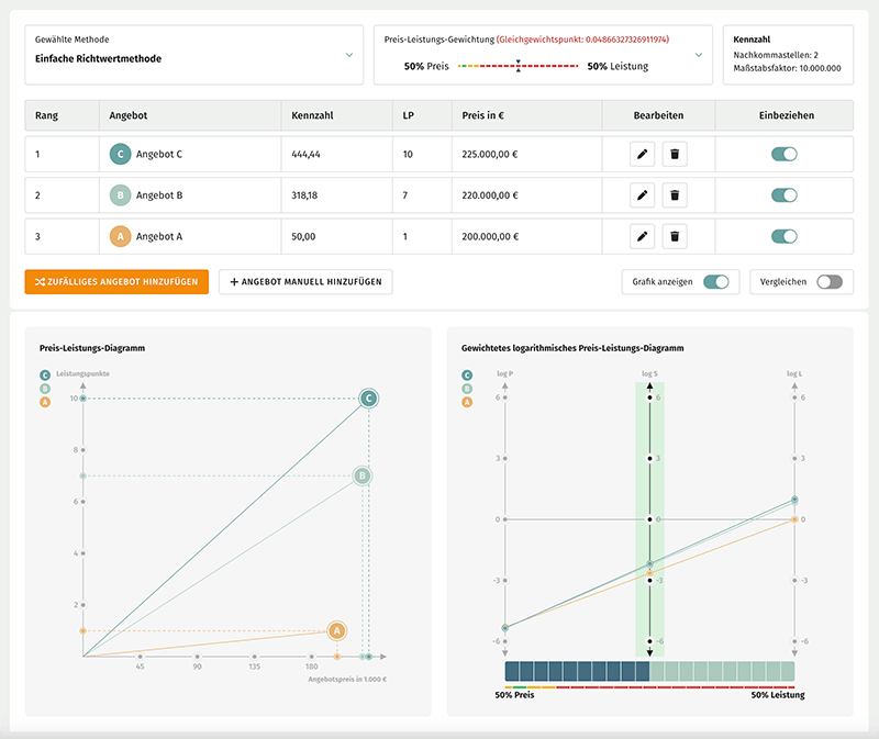 dann erkennt man am gewichteten Preis-Leistungs-Diagramm, dass die 50% / 50% Gewichtung zu einem Alibi-Kriterium für den Preis führt. Der Preis ist mit einer sehr großen Wahrscheinlichkeit ein Alibi-Kriterium. Die Zuschlagsentscheidung wird nach dem Lieferzeitpunkt entschieden. Die Ampeldarstellung der Gewichtung im VergabeCalculator visualisiert dies zusätzlich.