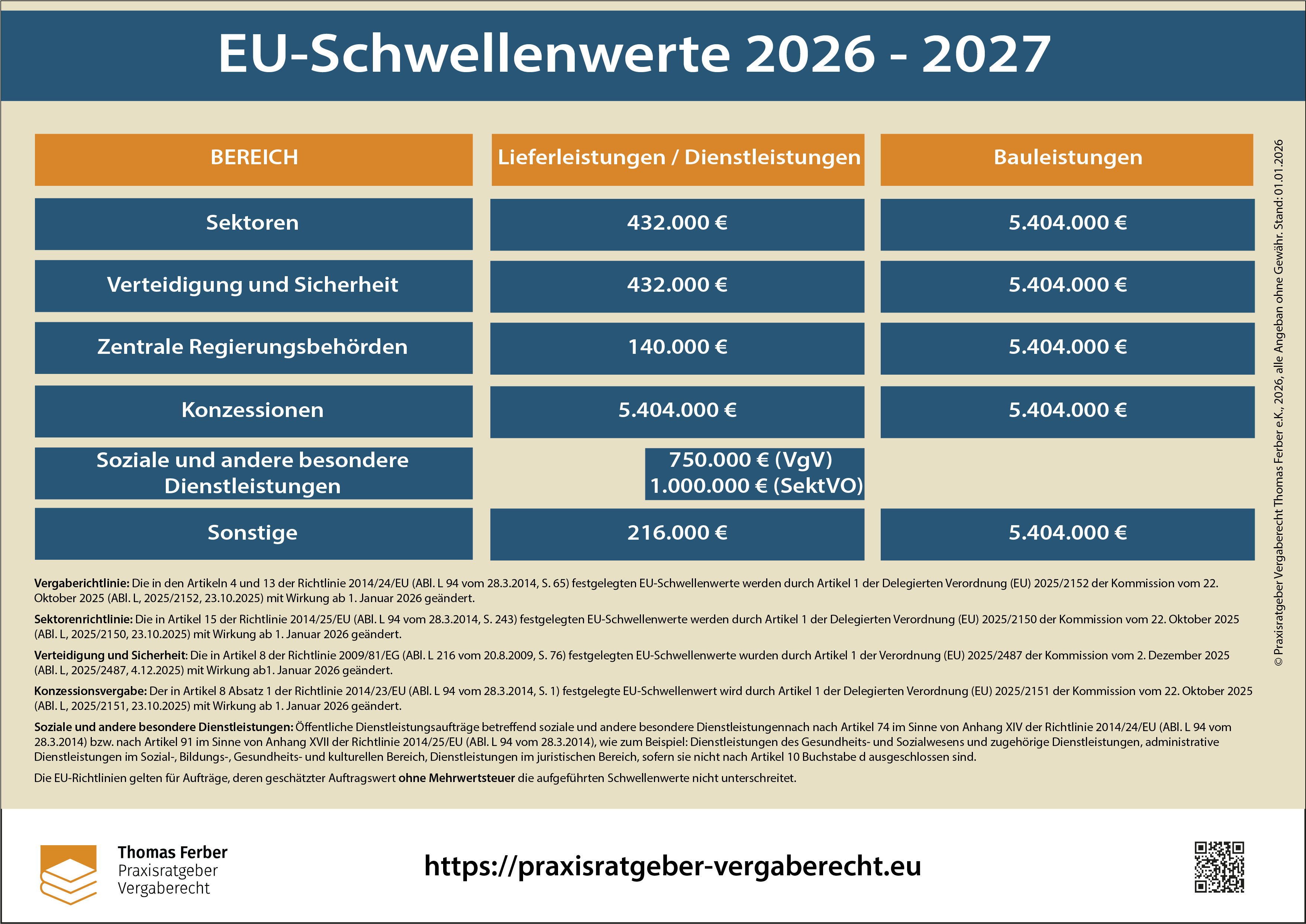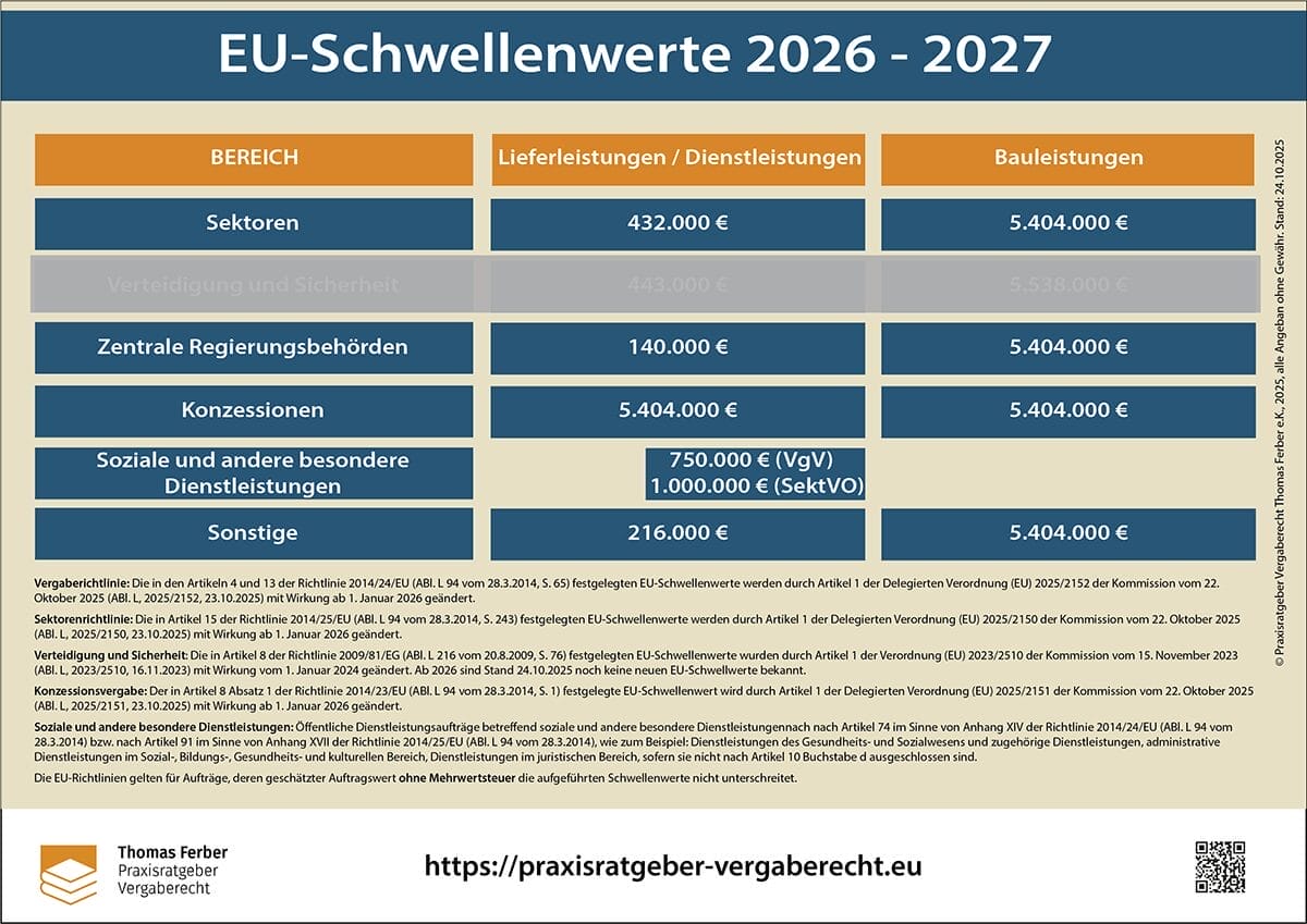 Vergaberichtlinie: Die in den Artikeln 4 und 13 der Richtlinie 2014/24/EU (ABl. L 94 vom 28.3.2014, S. 65) festgelegten EU-Schwellenwerte werden durch Artikel 1 der Delegierten Verordnung (EU) 2025/2152 der Kommission vom 22. Oktober 2025 (ABl. L, 2025/2152, 23.10.2025) mit Wirkung ab 1. Januar 2026 geändert.